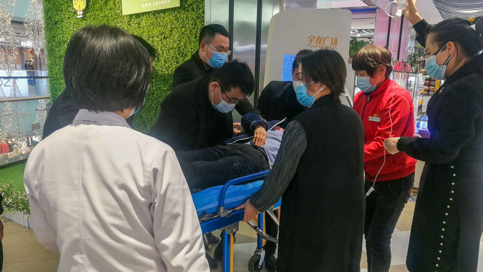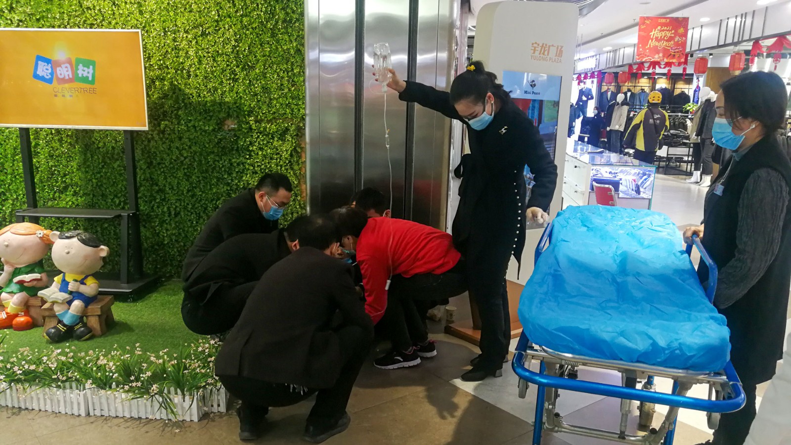 1月15日中午,一對年齡約60多歲的老夫婦在宇龍廣場用餐后,到達三樓中廳電梯口時,老太太突發不適暈倒在地,面色蠟黃,其老伴手足無措,急的滿頭大汗。附近專柜導購發現后及時通知當班主管谷孟文和當日總值班楚艷會,同時安撫好顧客。二人急速趕往現場,谷孟文及時撥打120,并不停詢問顧客的身體狀況,楚艷會通知相關部門人員現場支援。初步了解情況后為:該老人因心臟問題在人民醫院住院,未經醫生允許私自外出導致本次突發事件。
