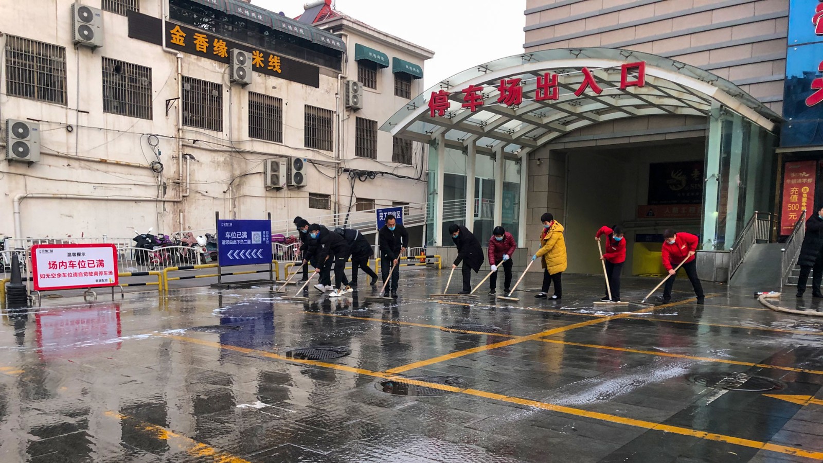 在物業部經理及主管的帶領下,早上6點30分準備好所有的打掃工具,物業部保潔科、安???、公寓樓物業、維??乒踩畞砣?,打掃工作共分三各部分進行:地面清潔、垃圾清理、地面沖洗。因外廣場面積較大,為將衛生打掃的更徹底,分片區集中清理,所有人不分職務高低,不畏嚴寒,熱情高漲揮舞著手中的工具對地面進行清理和沖洗,在大家近2個小時的齊心協力,外廣場煥然一新。