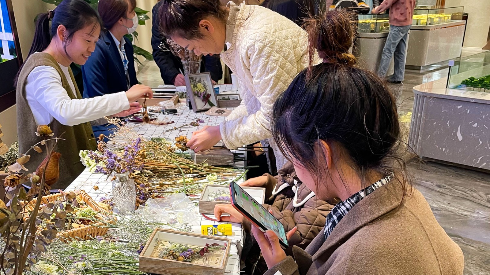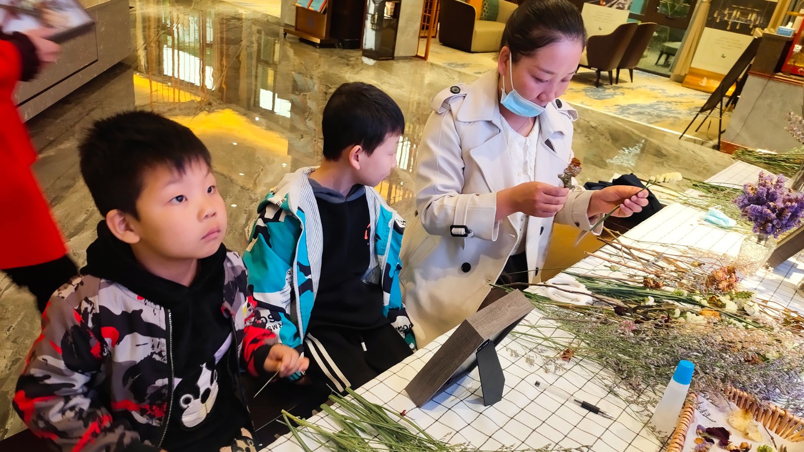 永生花是使用高科技手段,將鮮花經過脫水、保色、干燥等工序加工而成的干花,它既保持了鮮花的特質,又代表著時光的見證與呵護。到訪客戶興致盎然,利用現場準備齊全的花藝工具,變身為“花藝大師”,在想象力的指導下,將已風干的花朵、枝葉靈活搭配并涂上膠水,讓干花“活”了起來,把搭配好的永生花粘貼在備好的相框內,制成干花相冊,此后的每天,睜開眼望見,就能收獲怡然的好心情。前來參加的小朋友們也沉浸其中,成為專注的制作者,從架勢、布局到色彩搭配……充分展示著自己純真獨特的審美,天賦和巧思可見一斑。隨著時間的流逝,各種相框繽紛出爐,一切都變得萌動起來,孩子們捧著自己的手工作品時不時地露出開心的笑臉。這一刻所有人的喜悅都定格在這段充滿著花草芳香的慵懶時光中,大家在芬芳和絢爛中,感受花藝帶來的成就和滿足感。