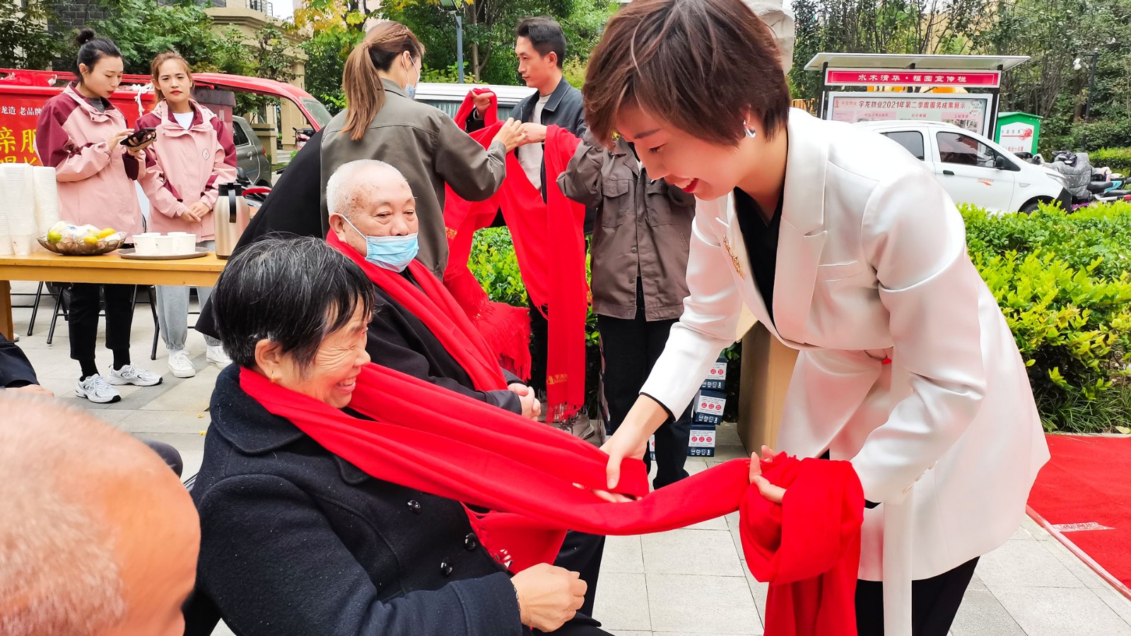 園區老人相聚一堂,演出開始前,物業工作人員親手為老人系上了愛的紅圍巾,在寒冷的天氣為他們送上了幾分暖意?;顒蝇F場老人談家常、話重陽。舞蹈、快板、戲曲等等精彩節目呈現,掌聲陣陣,歡笑不斷。