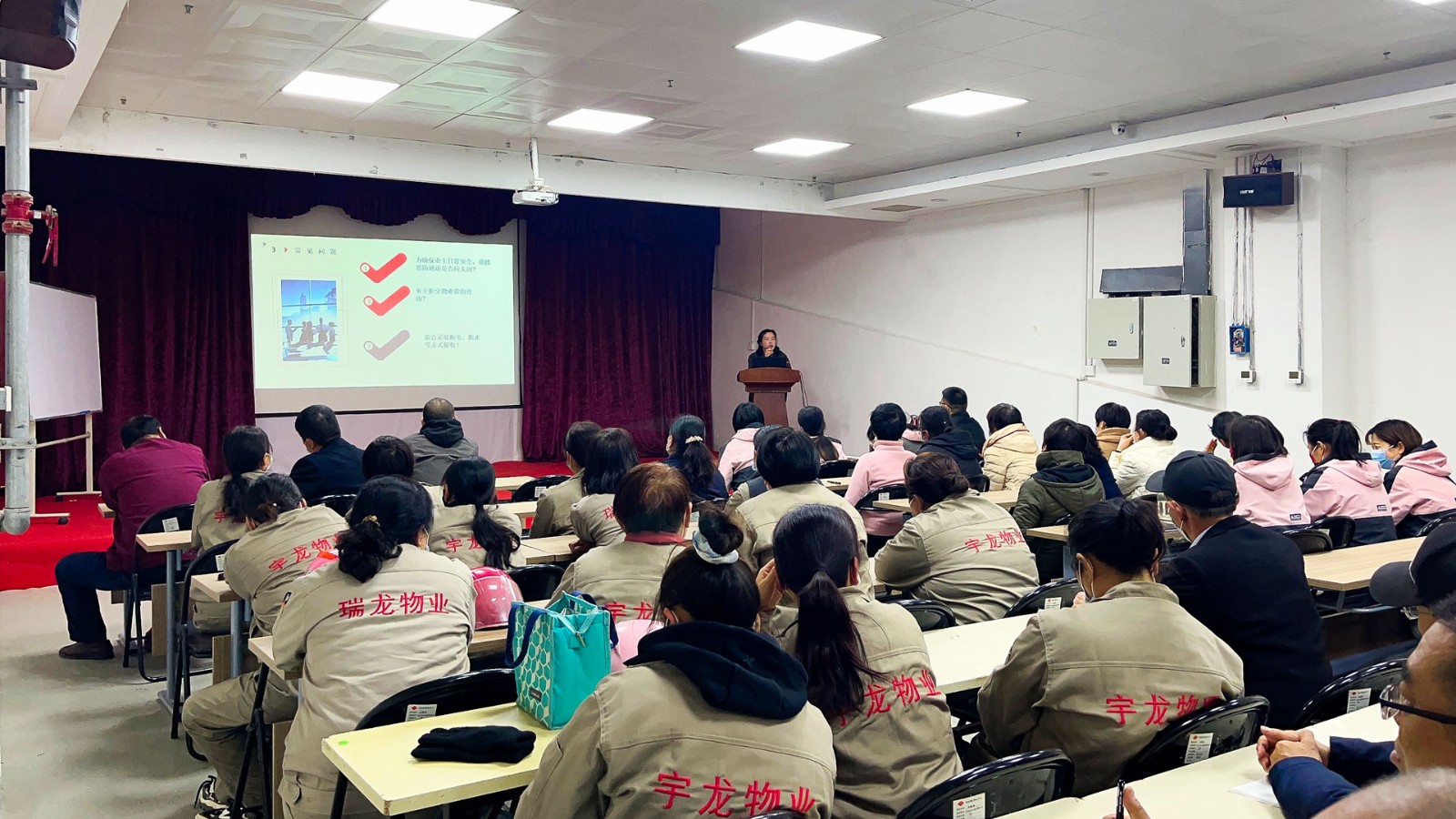 為培養物業從業人員的法律意識,提升物業公司員工服務能力,3月15日下午,集團公司法務許夢書受邀為物業公司、公寓樓物業部、安保部人員在宇龍廣場負一層會議室開展“物業行業法律知識”培訓。講座以線下方式召開,百余名人員參訓。