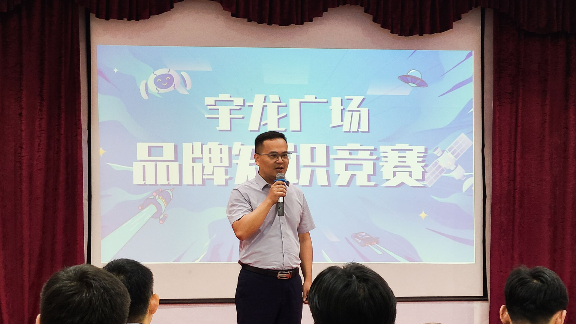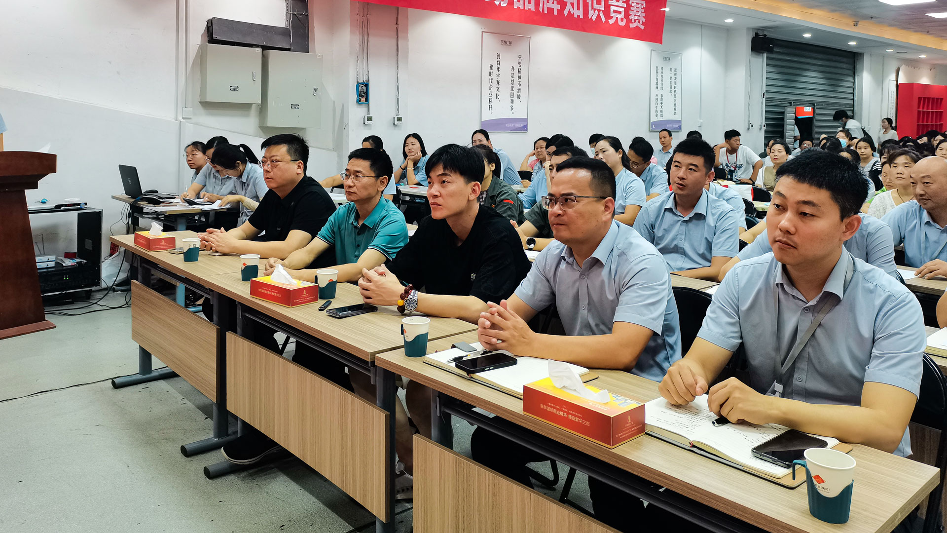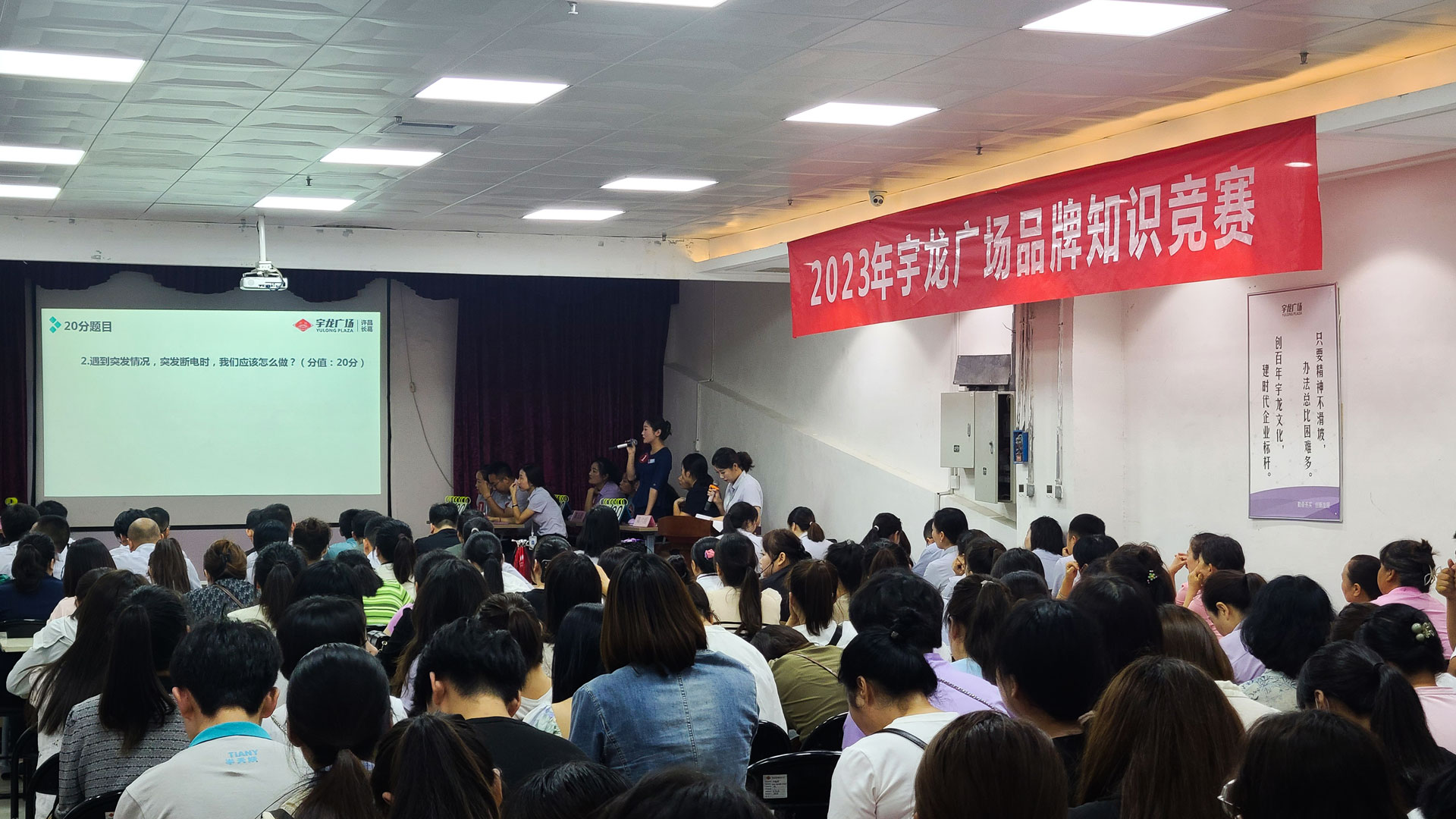 為強化導購員商場品牌知識基礎,提高員工服務意識,培養員工團隊協作精神,宇龍百貨公司于8月25日上午,舉辦了品牌知識競賽,出席此次活動的有集團公司總經理岳鵬濤、副總經理祁雙印、百貨公司執行董事胡黎明、總經理王劍、集團管理部同事,本次比賽由各部門負責人、樓層經理擔任評委,現場參加人員共有二百余人。在經過兩個多小時的精彩角逐,三樓團隊獲得了團隊第一名,特邀請集團總經理岳總為獲獎團隊頒發獎品,臺下觀眾為他們喝彩歡呼。